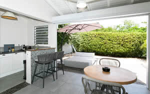 Lodge avec terrasse végétation tropicale.