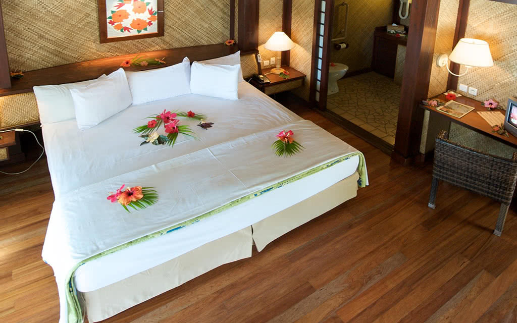 D’architecture polynésienne, les chambres et bungalows sont équipés de climatisation, salle d'eau, sèche-cheveux, mini-bar, télévision, coffre-fort, téléphone. Thé/café (Bungalows plage et sur pilotis).
